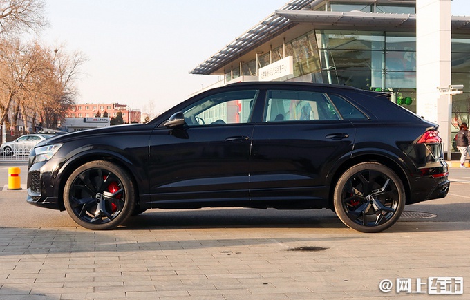 奥迪RS Q8相比普通车型加入了RS家族最新的外观套件,前脸八边形进气格栅内部改为黑色蜂窝装饰,下包围加入大尺寸贯穿式银色獠牙装饰。新车车身侧面配备银色后视镜壳,下方标配22英寸轮毂并搭配红色刹车卡钳。排气为双边共四出式布局,并采用RS系列标志性的椭圆形尾喉,贯穿下包围装饰与车头相呼应。