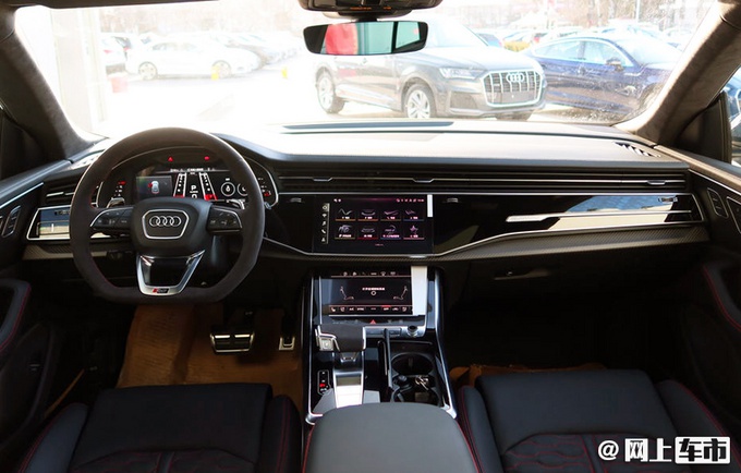 内饰方面,RS Q8整体布局与普通Q8基本一致,配备12.3英寸全液晶仪表,UI界面也做出了升级,中控台10.1+8.6英寸屏幕加入了车辆运动模式调节等功能。此外新车还配有RS运动座椅、Alcantara RS方向盘、碳纤维饰板等专属配置,彰显其高性能车型特殊身份。