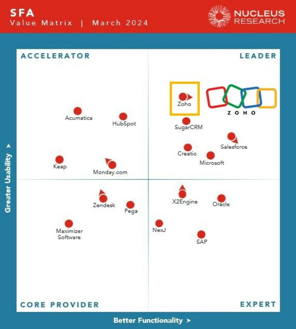 不久前,连续12年入选Gartner SFA魔力象限的Zoho CRM再获认可,入围Nucleus Research 2024 SFA技术价值矩阵,位居"领导者"象限。