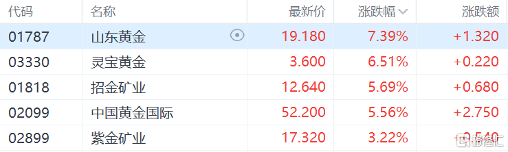 港A股市场上,黄金股也同样延续近期的涨势。港股中的山东黄金(19, 1.14, 6.38%)涨7.39%,灵宝黄金(3.47, 0.09, 2.66%)涨超6%,招金矿业(12.74, 0.78, 6.52%)、中国黄金国际(51.35, 1.90, 3.84%)涨超5%。