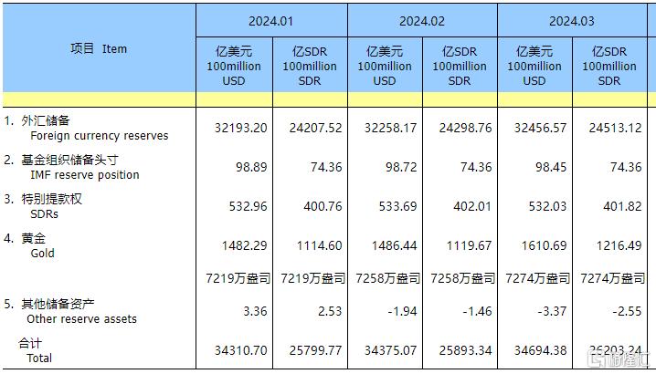 对于3月外汇储备规模变动的情况,国家外汇管理局指出,2024年3月受主要经济体货币政策及预期、宏观经济数据等因素影响,美元指数上涨,全球金融资产价格总体上涨。汇率折算和资产价格变化等因素综合作用,当月外汇储备规模上升。