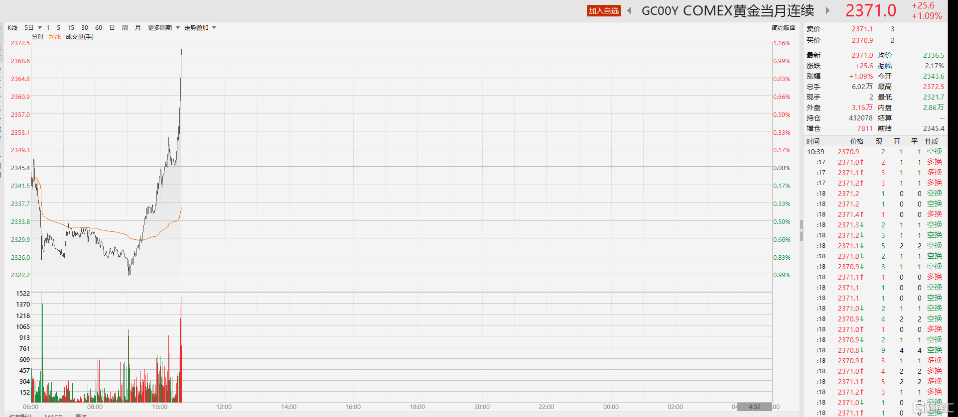 4月8日,现货黄金短线上涨16美元,报2343.5美元/盎司续创新高;COMEX期金日内涨幅超1%,现报2371美元/盎司。