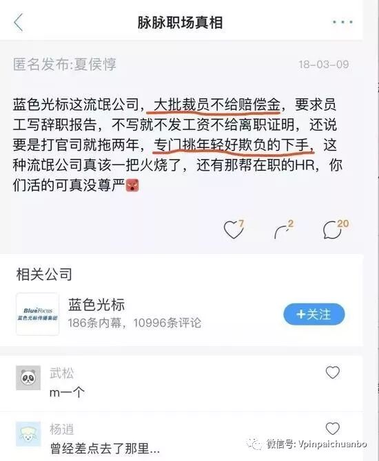 巧合的是,就在一周前,职场社交平台脉脉上也曝出了关于蓝标的“流氓”行径。匿名爆料显示,蓝标在大批裁员时不给赔偿金,要求员工写辞职报告,如果不写就不发工资、不给离职证明。